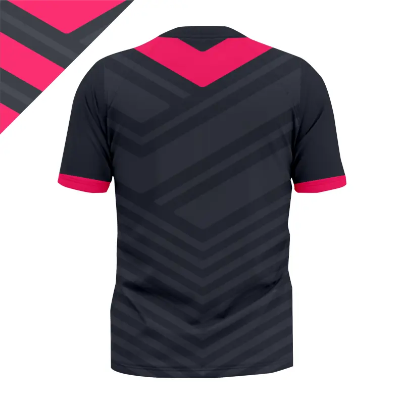 Hadir dengan perpaduan warna charcoal dark grey yang elegan dan aksen magenta yang elektrik, jersey ini dirancang untuk Anda yang ingin tampil menonjol namun tetap profesional. Desain geometris chevron yang modern memberikan kesan futuristik, sangat cocok digunakan untuk tim e-sports, futsal, lari, hingga aktivitas gym.