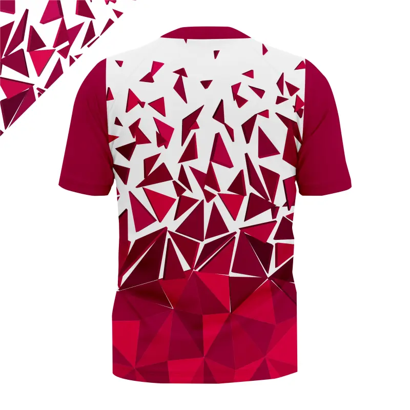 Dibuat khusus untuk Anda yang menginginkan tampilan berbeda di lapangan. Jersey ini menggabungkan seni Low Poly Geometric dengan kombinasi warna merah marun yang elegan dan berani. Pola pecahan kristal yang menyebar memberikan visual yang futuristik dan dinamis.