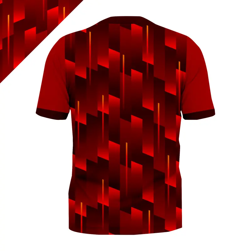 Hadir dengan desain grafis geometrik yang agresif dan modern, jersey ini dirancang untuk Anda yang ingin tampil beda di lapangan maupun di arena gaming. Perpaduan gradasi warna merah yang tajam memberikan kesan energi, kecepatan, dan keberanian.